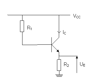 Zadanie 3: Dla układu jak na poniższym schemacie (gdzie VCC = 10 V, R1 = kΩ, R2 = 10 Ω, β = 100) wyznaczyć napięcie UE.