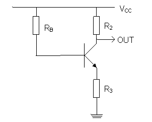 Zadanie 5: Dla układu działającego jak na poniższym schemacie (gdzie β = 100, VCC = 10 V, UOUT = 5 V) wyznaczyć rezystancje rezystorów R1, R2, R3.