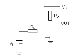 Zadanie 6: Dla układu jak na poniższym schemacie (gdzie VDD = 5V, Vbias = 2V, RD = 5kΩ, RS = 10 kΩ) wyznaczyć VDS oraz policzyć wzmocnienie napięciowe (KV).